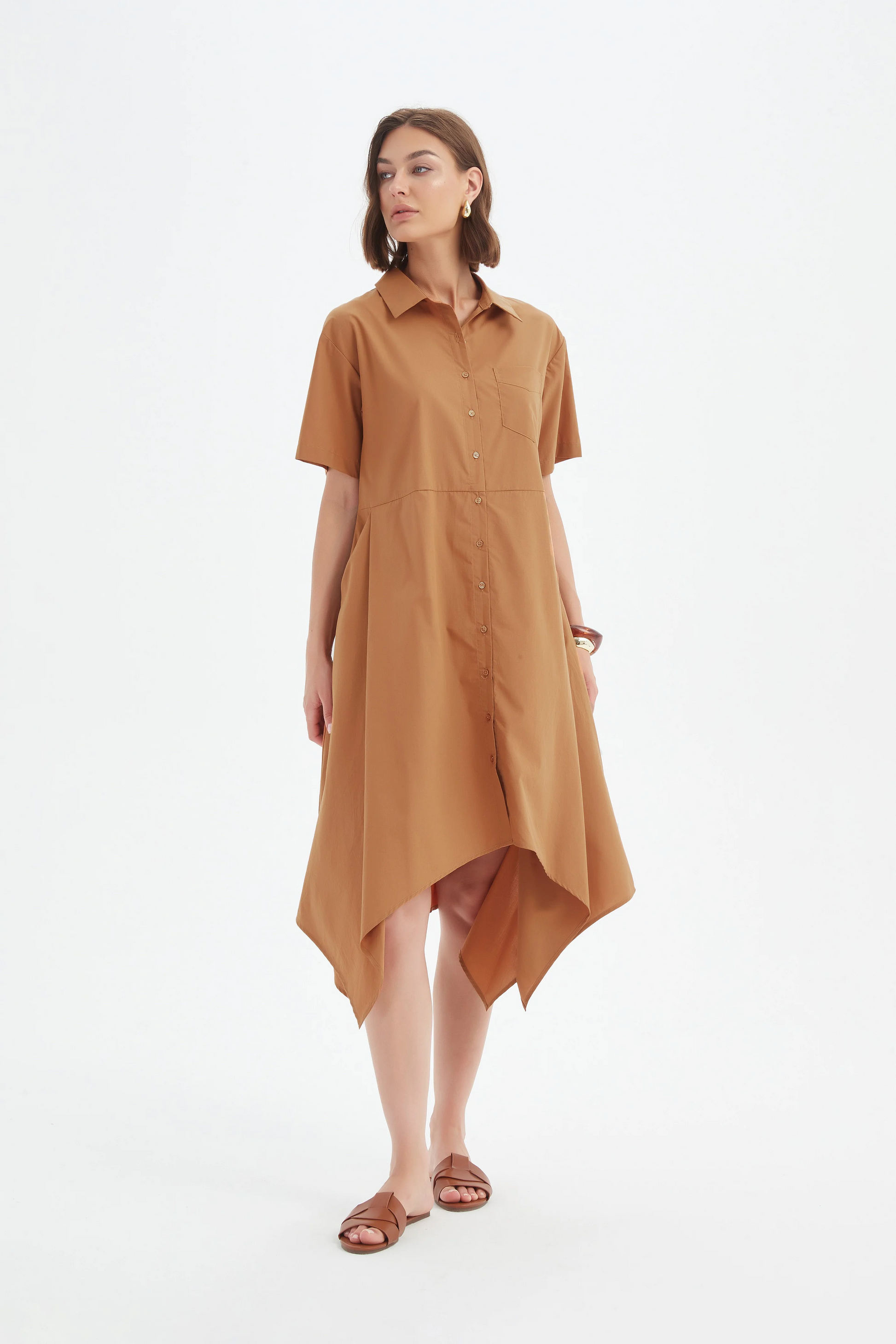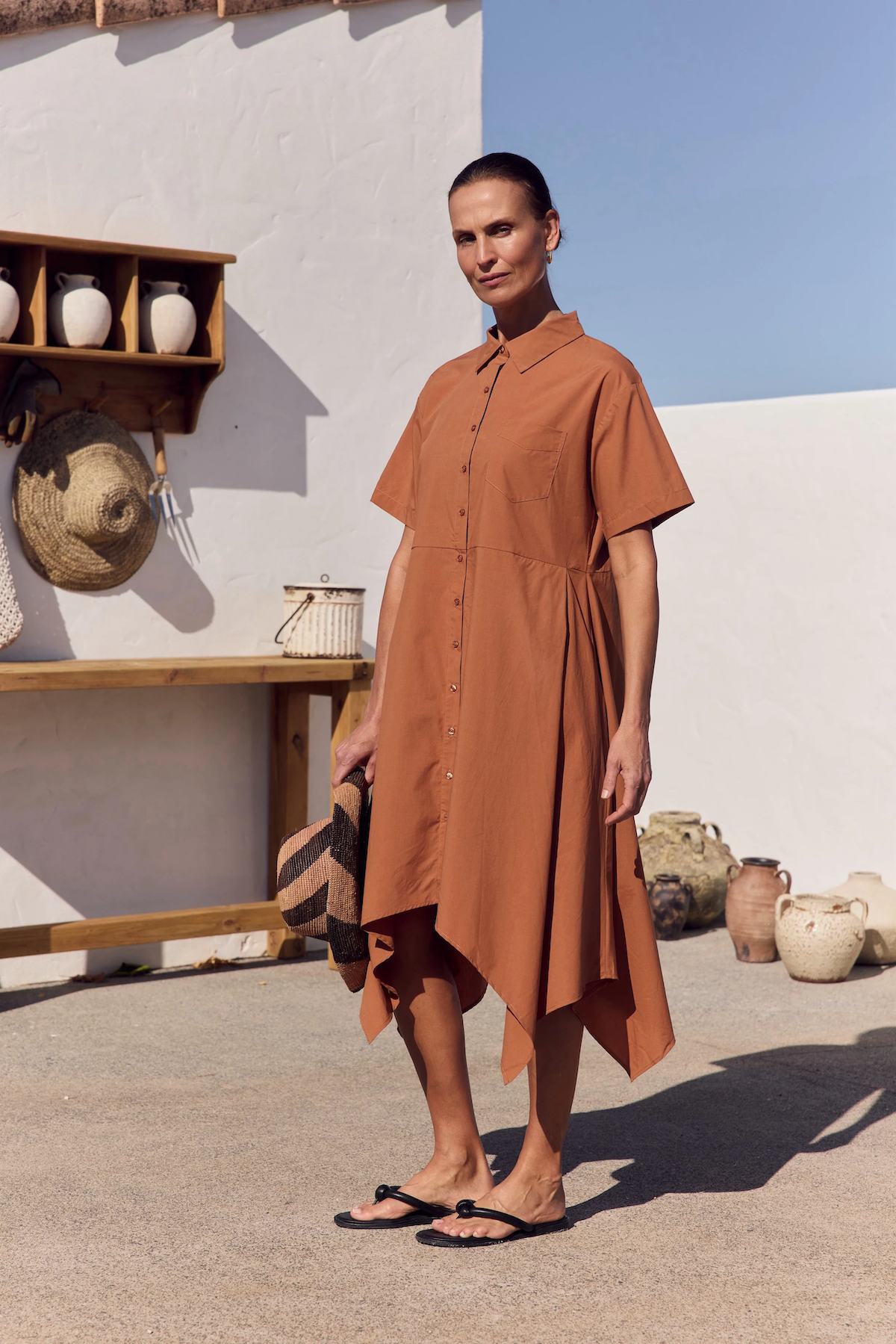 The Hanky Hem Shirt Dress offers adaptable styling, functioning seamlessly as both a shirt and dress. Featuring a traditional collar, short sleeves, and convenient side pockets, it balances comfort with functional wearability. Its distinctive handkerchief hem adds a contemporary edge, providing fluidity and a sophisticated yet casual look suitable for all-day wear.