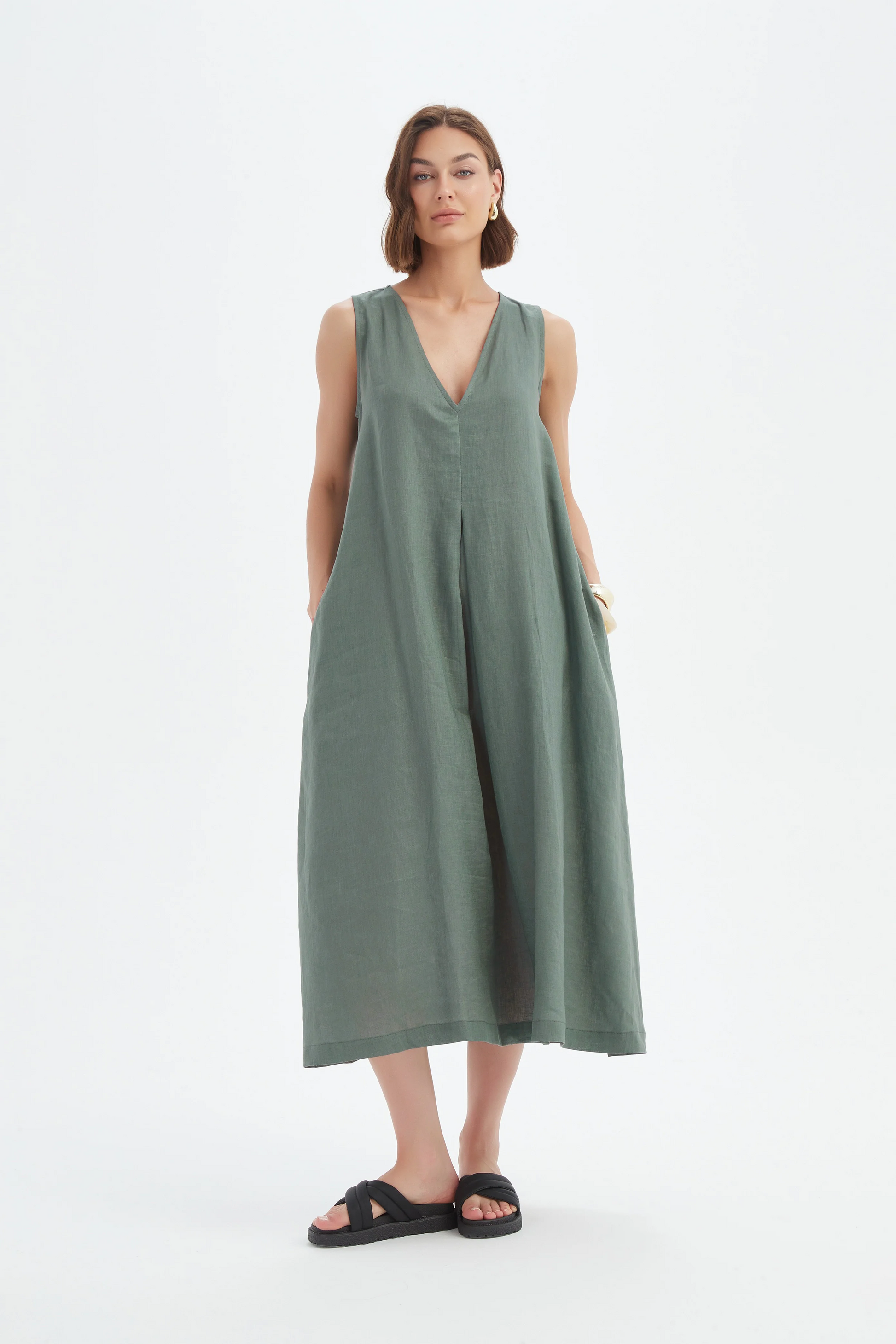 Effortless sophistication meets modern design in the Inverted Pleat Dress. Crafted from 100% French linen, this sleeveless midi dress features a flattering v-neckline, inverted pleat detailing at the front, and an A-line silhouette that moves gracefully. With convenient pockets and a relaxed yet refined shape, it’s perfect for sunlit days, weekend escapes, or polished everyday dressing.