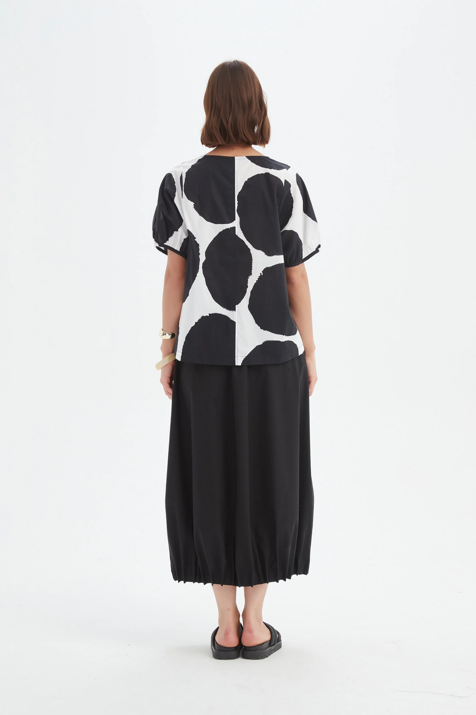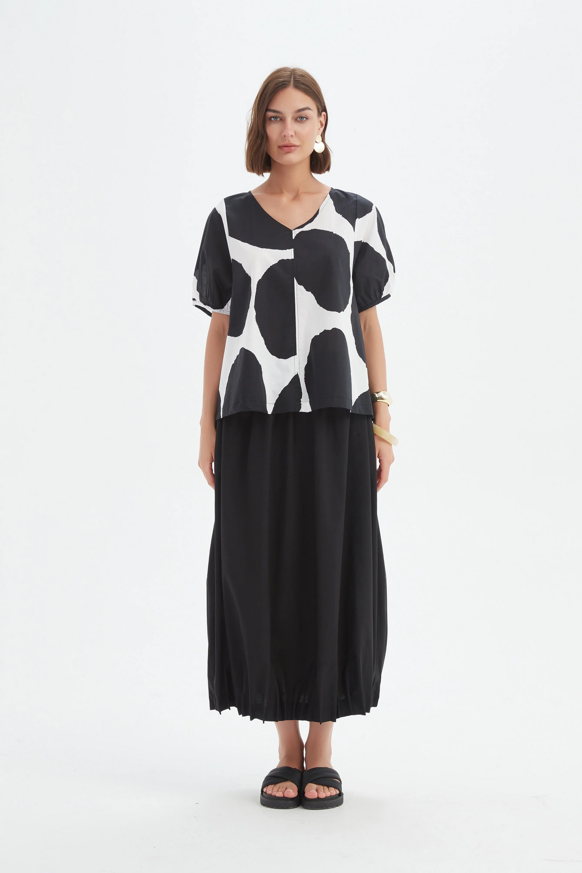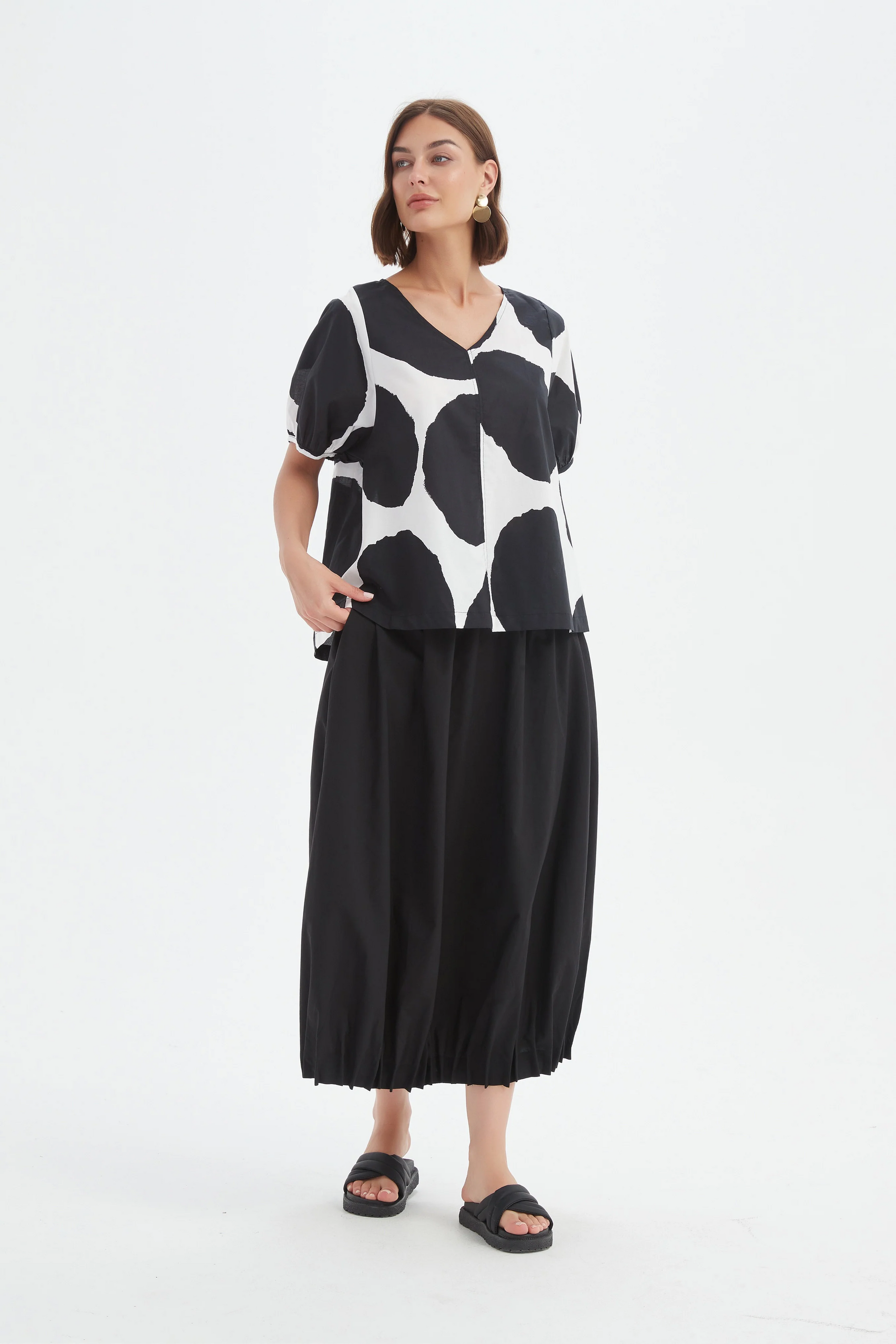 Tirelli V Neck Bishop Sleeve Poplin Top - Black/White Spot