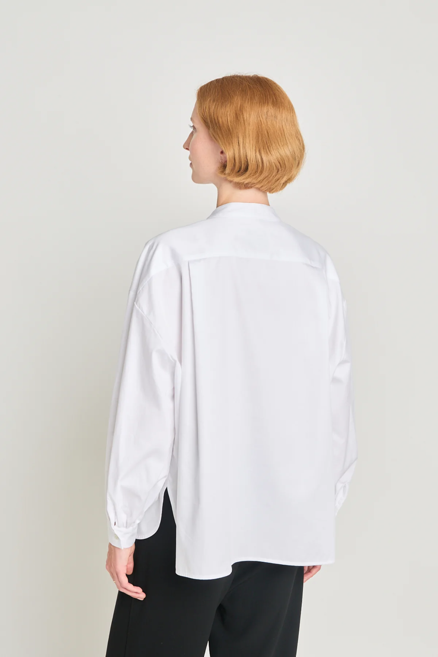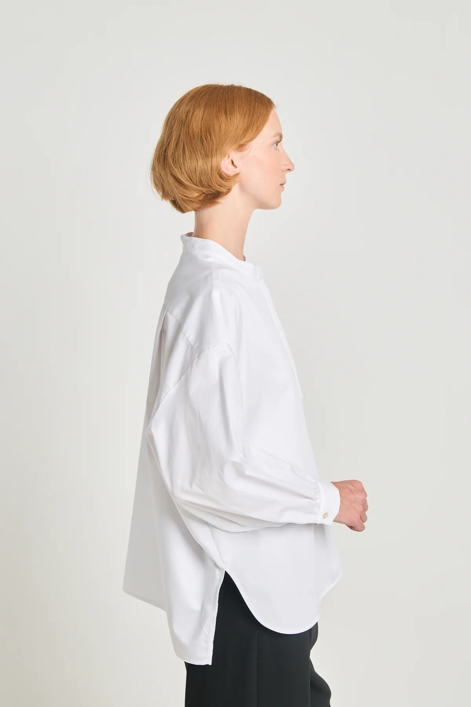 A simple long-sleeved cotton shirt with dropped shoulder, loose bodice, collarless neckline and placket.