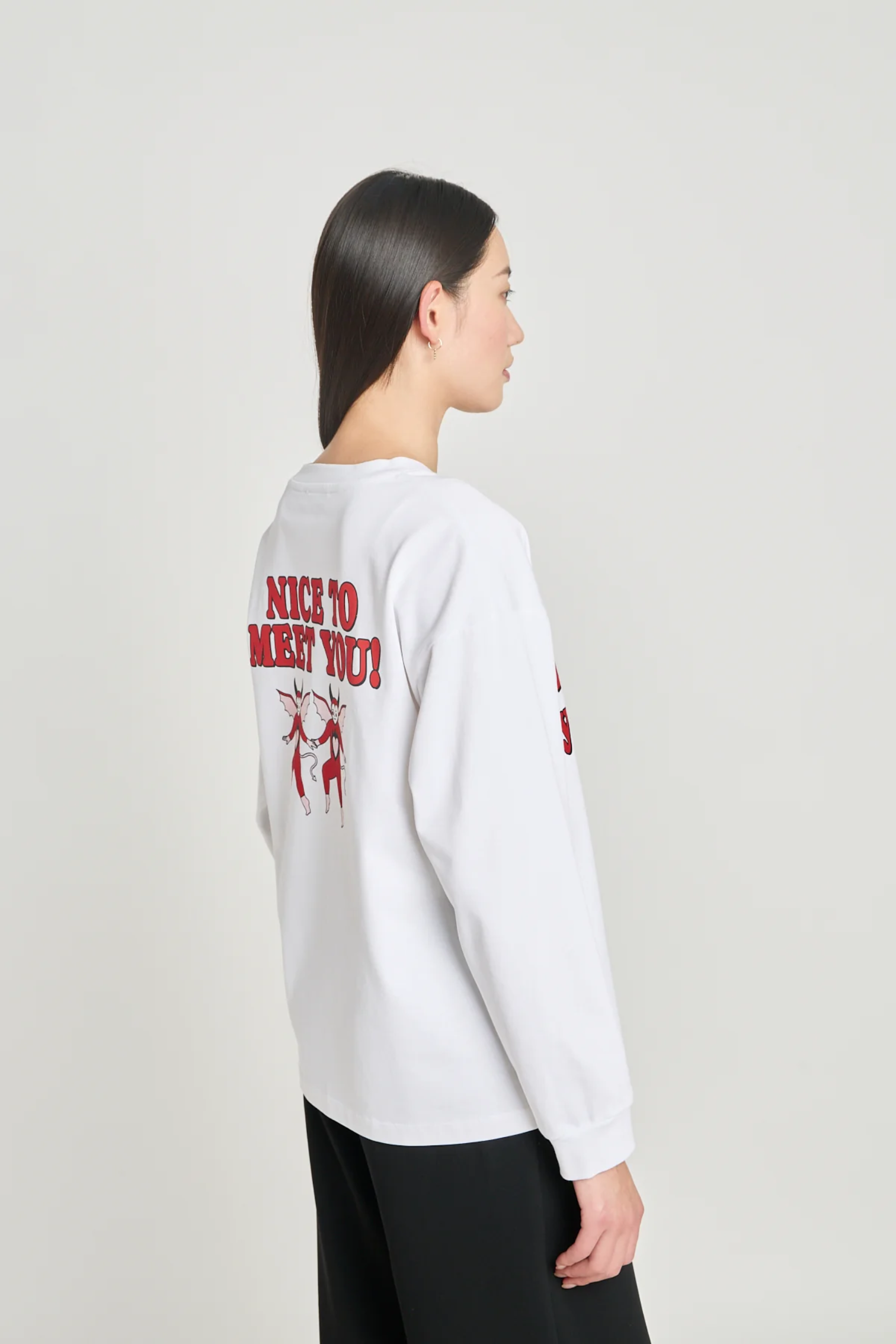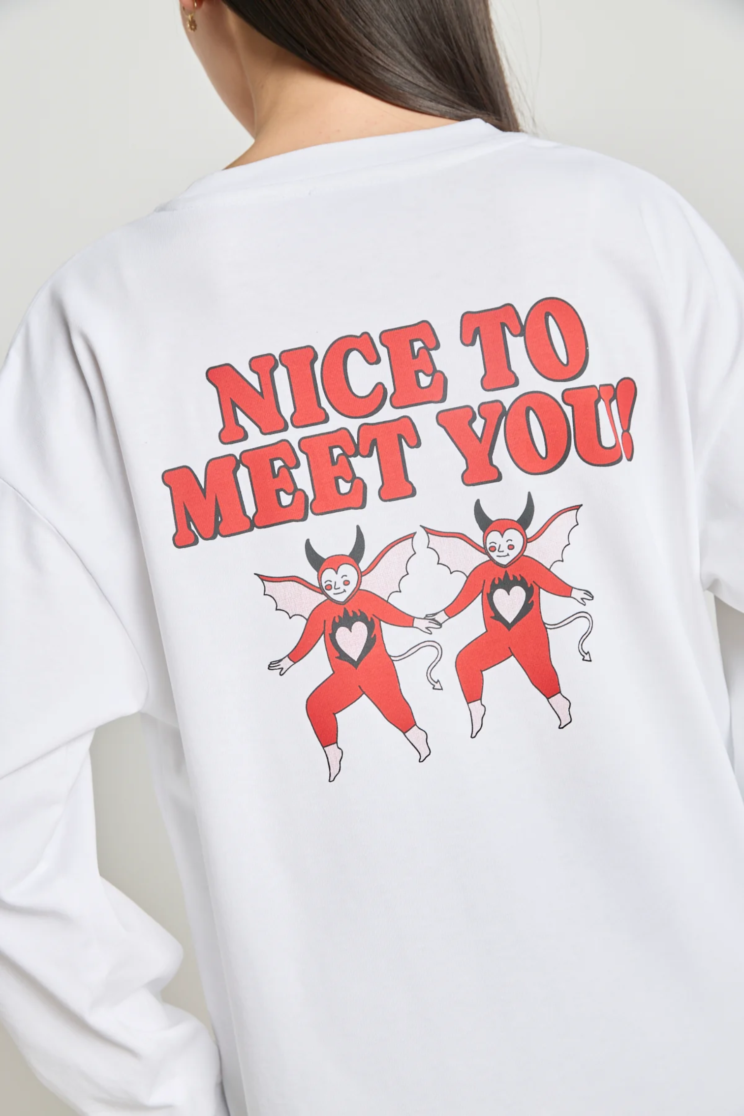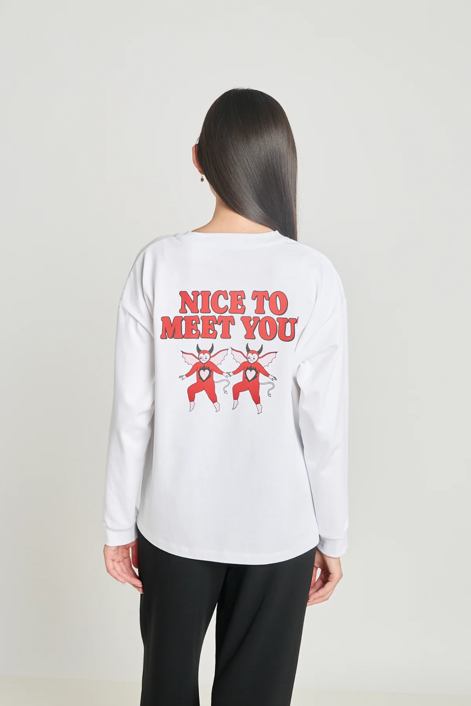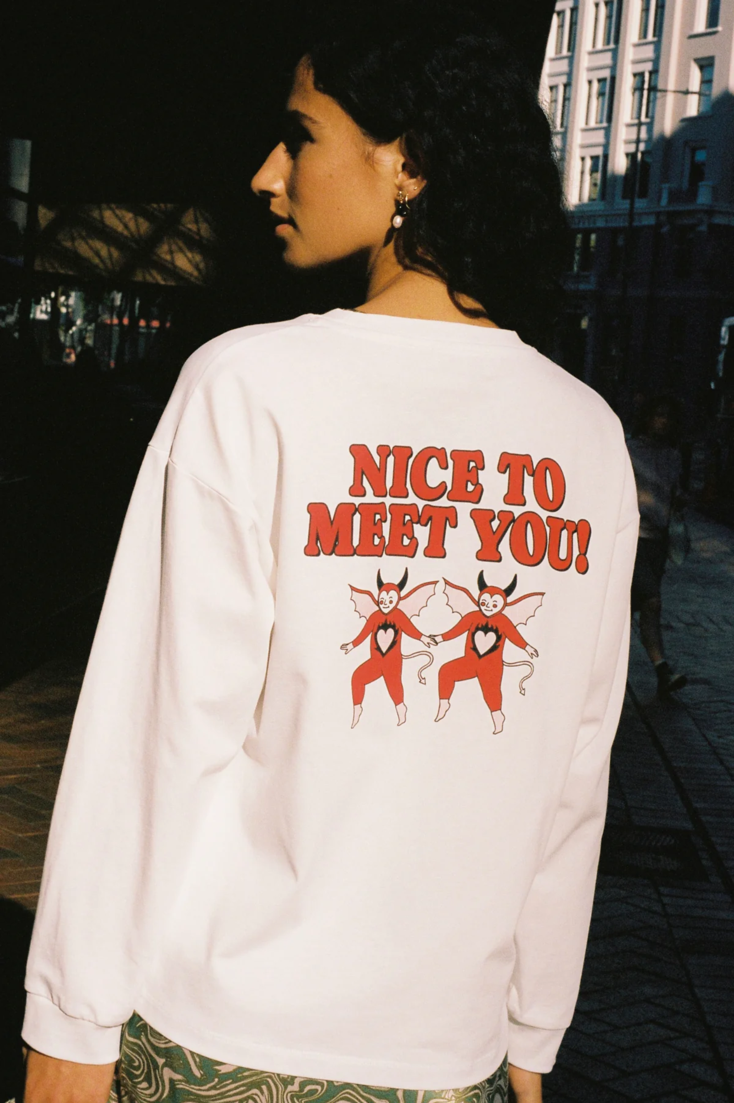 Better the devil you know... Well, nice to meet you! This relaxed long-sleeved tee features a slighter gather at the cuff, and custom prints front and back.