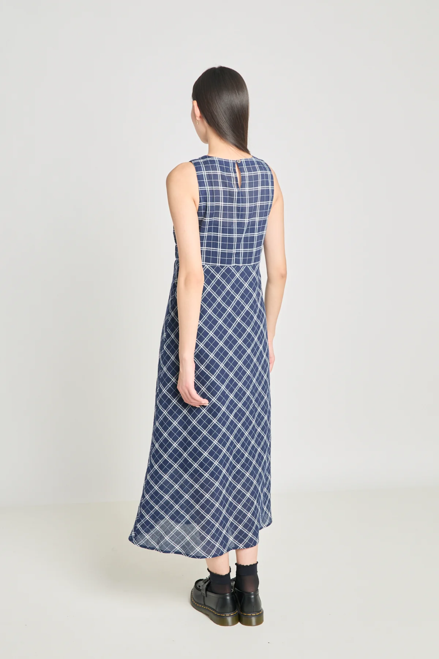 The Practice dress is a simple sleeveless pinafore dress with fitted bodice, and long, bias-cut skirt, cut in a deadstock navy plaid cotton.